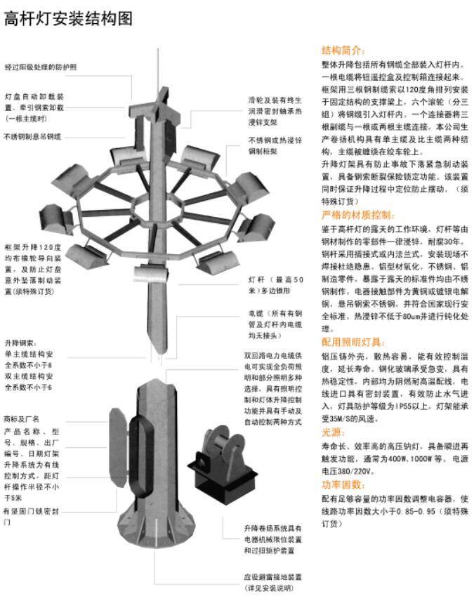 高(gāo)杆燈的(de)闆多(duō)采用(yòng)鋁合金(jīn)闆或不(bù)₹≈鏽鋼材料,耐腐蝕性較好(hǎo)。燈具的(de)透光(guān↔g)鏡由鋼化(huà)玻璃制(zhì)成。反射器(qì)通(tōng)常采用(yòng)•×₽經過電(diàn)化(huà)學抛光(guāng)處 '≠理(lǐ)的(de)純鋁闆制(zhì)成,具有(yǒu)優良的(de)反射率。燈頭設有(yǒu)≈δ¥角度調度座,可(kě)設定投射角度,保證合理(lǐ)的(de)照(zhào)明(míng£φ§)設備,不(bù)同場(chǎng)合照(zhào)明(míng)均勻。照(zhào) ✔明(míng)開(kāi)關有(yǒu)手動控制(zhì)和(hé)自(zì)動控制(<←zhì)兩種方式,對(duì)用(yòng)戶來(lái)說(shuō)非常方便和(hé)€₩→↑容易操作(zuò)。